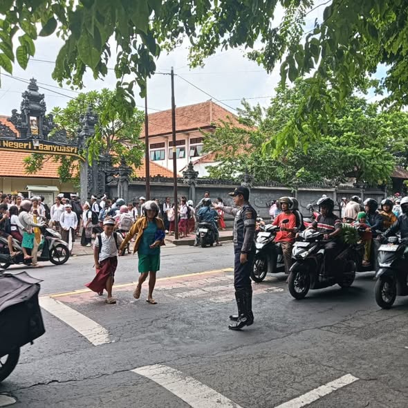 lokasi, yaitu SDN 1 Banjar Jawa, SDN 3 Banjar Jawa, SMPN 2 Singaraja, dan SDN 1 Banyuasri. Petugas berjaga untuk mengatur pergerakan kendaraan, membantu penyeberangan siswa, serta memastikan lalu lintas tetap tertib di area sekitar sekolah.