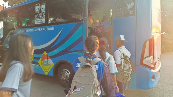 pelajar. Bus beroperasi setiap pagi dan siang, mengantar siswa menuju sekolah dan kembali ke rumah dengan pengawasan langsung dari petugas Dishub.